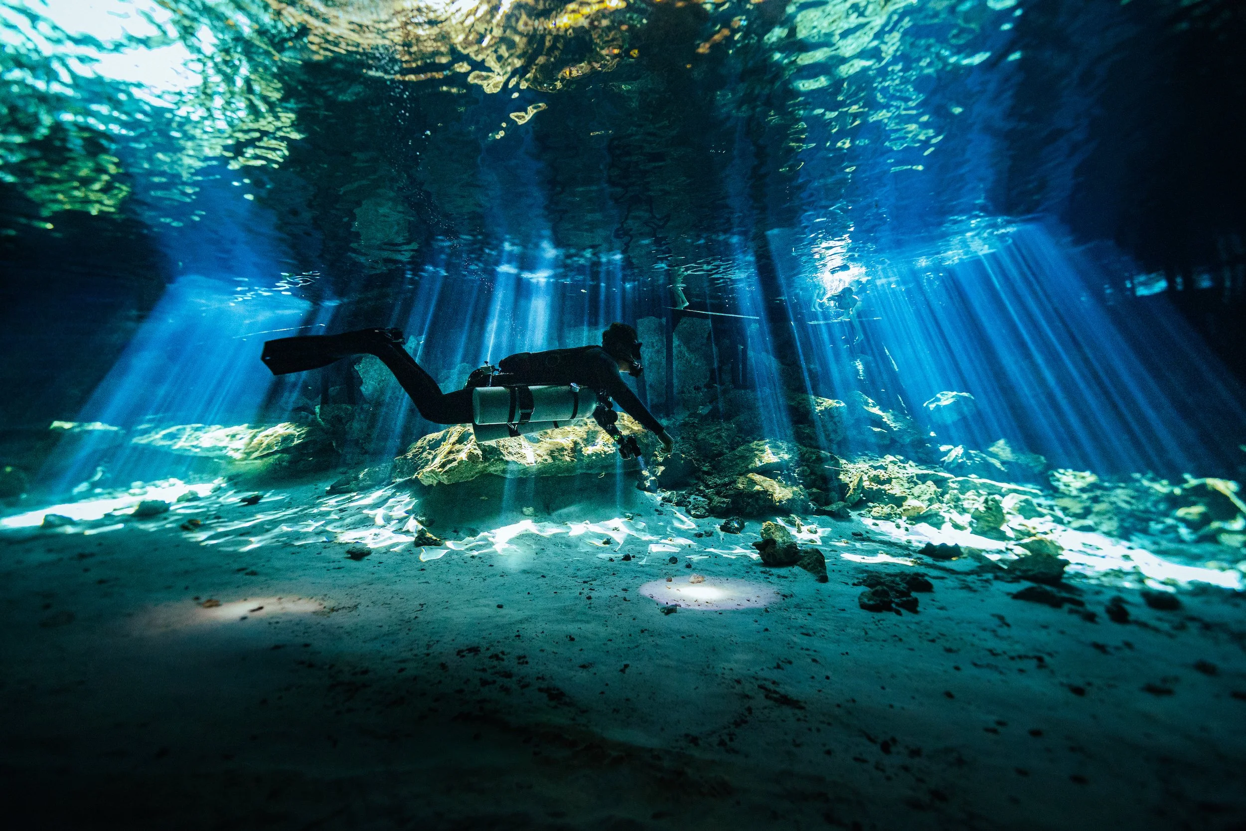 Crystal-clear freshwater caverns with dramatic light beams and unique formations.